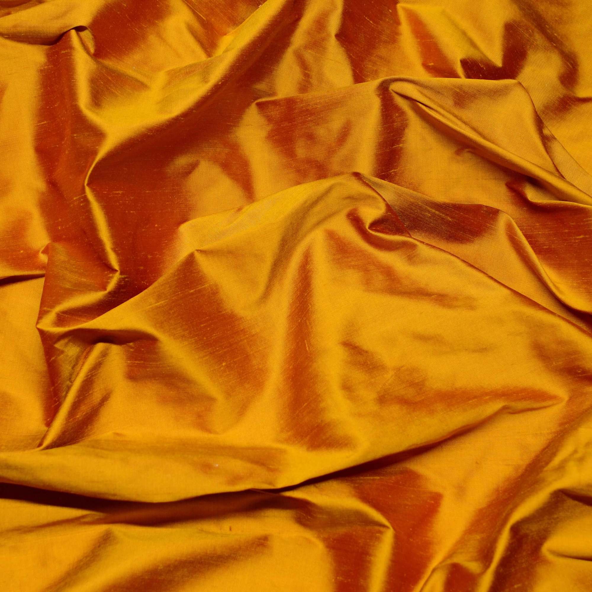 This Fabric is an iridescent Royal Gold Silk Shantung. It is 100% Silk. This is a machine and hand woven silk, that is smoother and crispier than Dupioni silk. It has much less slubs and texture than Dupioni. This shantung silk is a more tightly-woven fabric and the texture is in between Dupioni and silk taffeta. The silk shantung is yarn-dyed fabric. The Royal Gold shantung has Red warp (lengthwise yarn) threads and Gold weft (transverse yarn) threads.